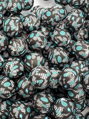 Turquoise and Black Bow Print Silicone Beads - 15mm - 10 CT