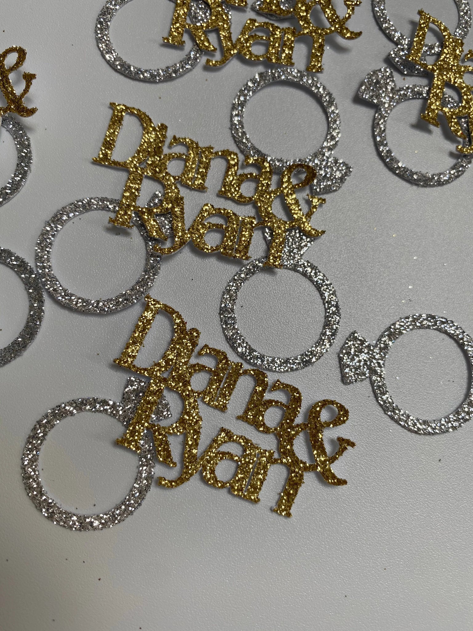 Sprinkle a personal touch on your engagement party or bridal shower tables with this fun confetti set! You’ll get 15 glitter confetti pieces personalized with two names in your choice of color, plus 35 sparkling glitter rings in gold or silver. Each piece measures about 1” tall with glitter on one side and plain white on the back, adding just the right amount of shimmer to your celebration.