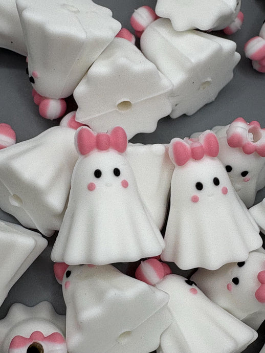 Ghost With Pink Bow 3D Silicone Focal Bead